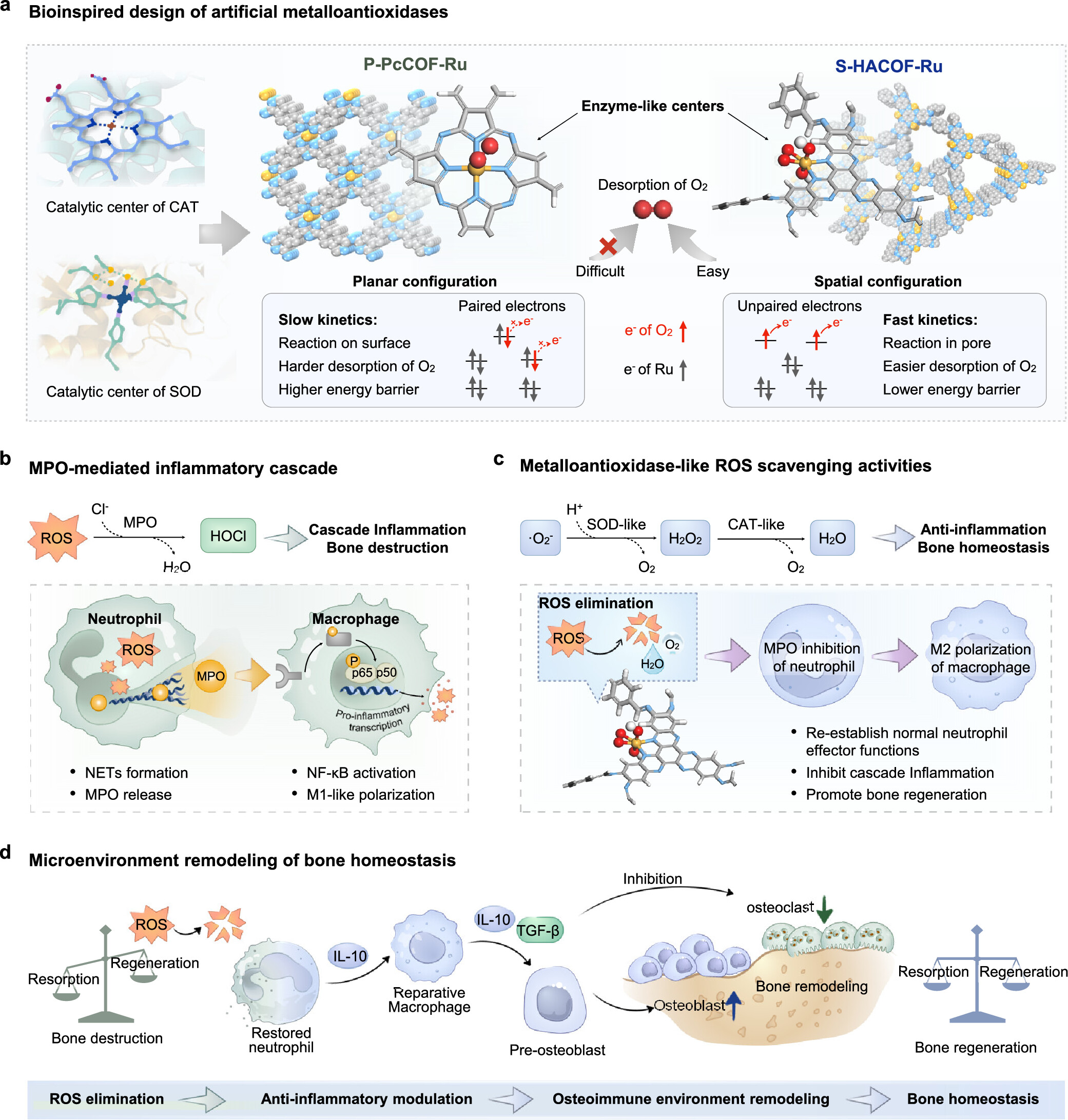 研究团队设计了一种空间构型的共价有机框架(COF)基人造抗氧化酶(S-HACOF-Ru)。该材料在催化过程中表现出未成对d 轨道电子结构和更低的反应能垒,从而在活性氧级联清除与氧化还原平衡调控方面展现显著优势。动物实验表明,该材料可有效抑制中性粒细胞 胞外诱捕网(NETs)的形成及MPO的释放,恢复中性粒细胞正常免疫功能,并阻断巨噬细胞的炎症级联反应,在恢复牙周组织的牙槽骨丢失和修复踝关节软骨损伤方面效果显著。