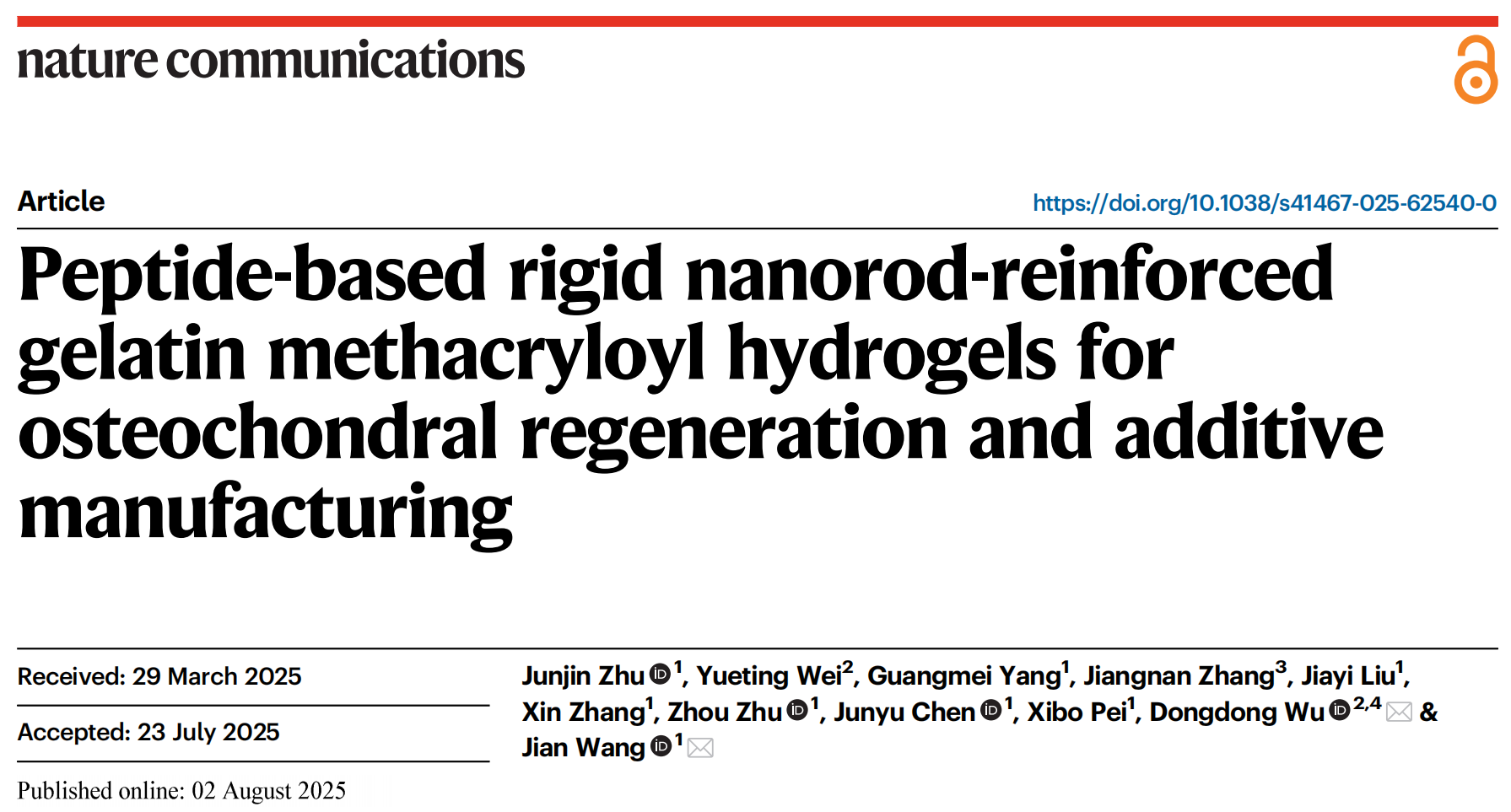近日,我院王剑教授与四川大学国家生物医学材料工程技术研究中心吴冬冬研究员团队在肽基刚性纳米棒增强水凝胶用于骨软骨再生及增材制造领域取得重要进展,成功开发出一种兼具优异力学性能与生物相容性的复合水凝胶,为骨软骨再生与个性化增材制造提供了新型材料平台。相关研究成果以 “Peptide-based rigid nanorod-reinforced gelatin methacryloyl hydrogels for osteochondral regeneration and additive manufacturing”为题,发表于国际权威期刊 Nature Communications 。