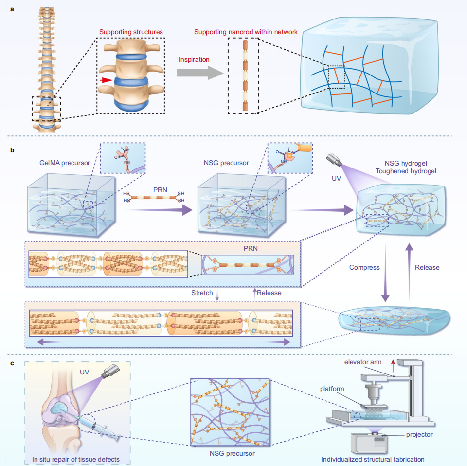 光固化GelMA水凝胶虽具有良好生物相容性和可打印性,在组织修复中广泛应用,但其脆性高、压缩性能较差,难以满足承重区域骨软骨再生的力学需求。现有的增韧方法多依赖于二次网络或矿物填料,往往存在工艺复杂、残留有毒溶剂、孔隙率降低和细胞活性受损等问题,制约其临床转化。受脊柱椎间盘支撑结构的启发,研究团队提出了一种基于肽基刚性纳米棒(PRNs)的增韧策略,通过先将PRNs与明胶甲基丙烯酰(GelMA)水凝胶共价结合,再进行光照固化,构建形成肽基纳米棒支撑网络。在受力时,PRNs可变形伸展并耗散能量,从而显著提升水凝胶的力学性能。该策略在提升力学性能的同时,保留了水凝胶良好的生物相容性和可光固化性,既可用于骨软骨缺损的原位注射,也可用于复杂结构的个性化增材制造,有效提高其抗压性,为提升个性化生物材料的性能设计提供了新的思路。