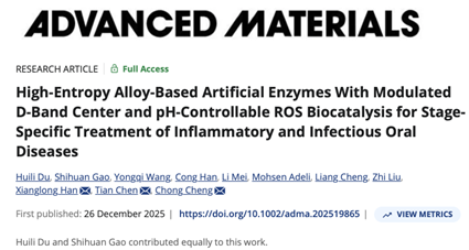 近日,我实验室陈甜助理研究员/韩向龙教授团队,联合四川大学高分子工程学院程冲研究员团队在pH响应性人工纳米酶用于炎症性和感染性口腔疾病的治疗方面取得重要进展,研究成果以“High-Entropy Alloy-based Artificial Enzymes with Modulated d-Band Centre and pH-Controllable ROS Biocatalysis for Stage-Specific Treatment of Inflammatory and Infectious Oral Diseases ”为题发表在 Advanced Materials杂志。程冲研究员、陈甜助理研究员、韩向龙教授为本文通讯作者,杜慧丽和高世桓为共同第一作者。