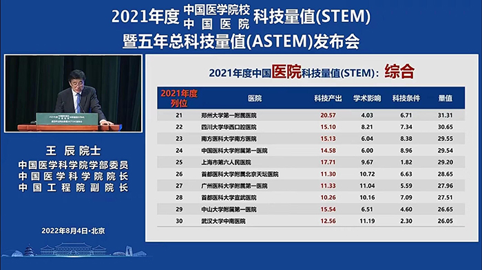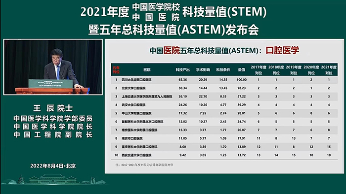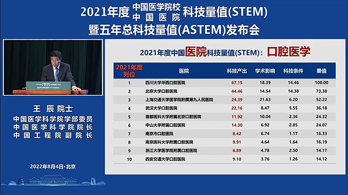 2022年8月4日下午,由中国医学科学院主办、中国医学科学院医学信息研究所承办的2021年度中国医学院校/中国医院科技量值(STEM) 暨五年总科技量值(ASTEM)发布会在北京协和医学院壹号礼堂举行。四川大学华西口腔医院在2021年度中国医院科技量值排行榜和五年总科技量值排行榜中荣获口腔医学第一名,在中国医院科技量值综合排行榜中位列第22位。