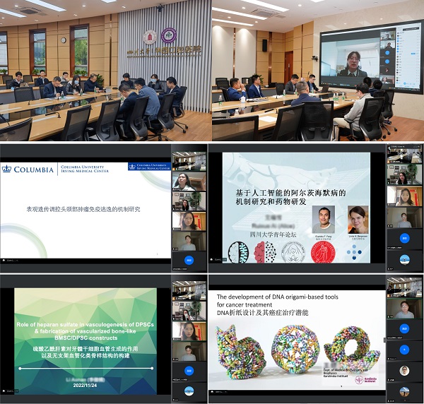 11月23日,来自国内外一流高校和研究机构的海内外青年学者通过线上的形式参与四川大学第十届全球青年学者论坛。11月24日,全球青年学者论坛口腔医学分论坛于我院教学楼华西厅举行,四川大学副校长、我院院长叶玲教授,院党委书记谭静教授,党委副书记林云锋教授,教授委员会主任赵志河教授,科研部、人力资源部、人才办公室等相关部门负责人及青年教师通过线上及线下的形式参加了本次论坛。来自美国哥伦比亚大学、瑞典卡罗林斯卡医学院、挪威奥斯陆大学、日本大阪大学的四位学者在线参与了论坛。叶玲教授向与会学者表示欢迎,并就我院现状、学科水平及师资队伍建设等内容进行了介绍。随后,四位海外学者分别以表观遗传调控头颈部肿瘤免疫逃逸的机制研究、基于人工智能的阿尔茨海默病的机制研究和药物研发、硫酸乙酰肝素对牙髓干细胞血管生成的作用、DNA折纸设计及其癌症治疗潜能为主题作报告,与会学者及在线观众就医学研究热点及前沿科学问题进行了交流。