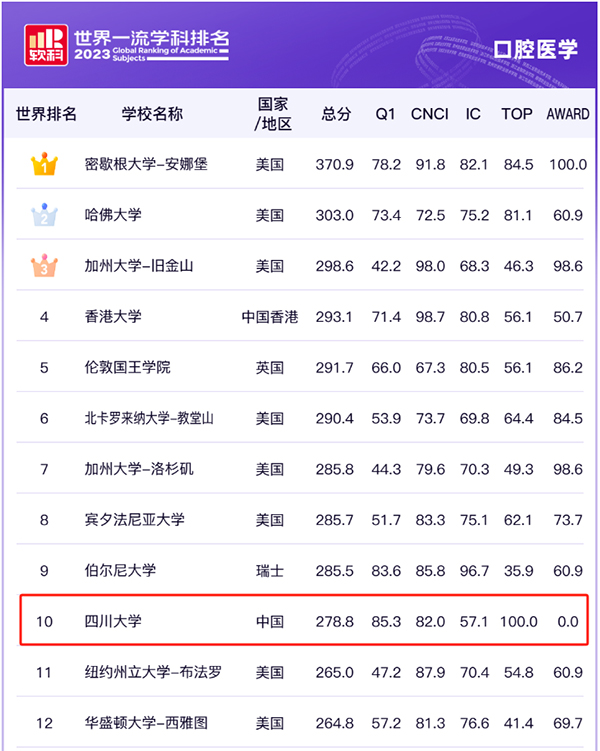 2023年10月27日,高等教育评价专业机构软科正式发布2023“软科世界一流学科排名”,2023年排名覆盖55个学科,涉及理学、工学、生命科学、医学和社会科学五大领域。四川大学口腔医学获得278.8总分,位列世界第10位,中国内地第1位,这是首次进入世界前十;其中在顶级期刊指标中获100分,位列世界第1。