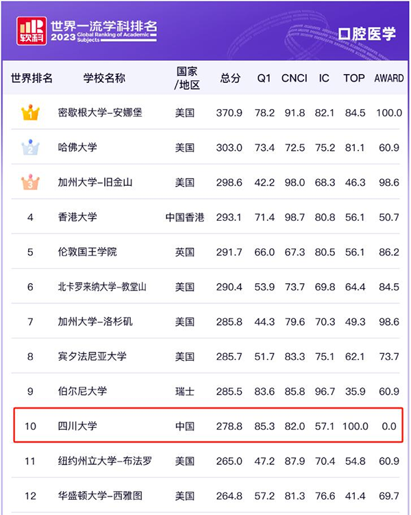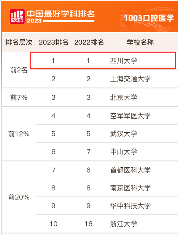 10.凝练方向深化内涵,学科建设成绩斐然。软科世界一流学科排名位列全球第10、中国内地第一;软科中国最好学科排名位列口腔医学第一;软科中国大学专业排名位列口腔医学第一;QS学科排行榜位列世界第26,中国内地第一;10位学者入选爱思唯尔中国高被引学者,位列口腔医学第一;1位学者入选科睿唯安全球高被引科学家,全国口腔领域唯一。