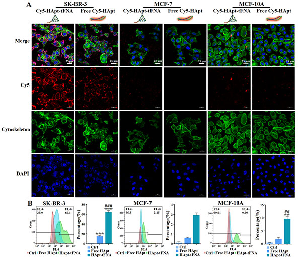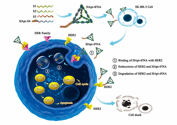 本文创新性地将适配体(Anti-HER2 Aptamer, HApt)的靶向性和DNA四面体材料的溶酶体降解特点巧妙地运用到一起,揭示了HApt-tFNA能够更有效地促进HApt-tFNA-HER2复合体进入细胞的溶酶体使HER2被溶酶体降解而减少,进而引起细胞的生长停滞并凋亡。相关研究在线发表后,被选为“ACS Editors’ Choice” (Top 1%)及“Press Release”,并获得F1000推荐,还被AZO Materials, The Medical News, Long Room, Azonano, ecancer, Technology Networks, Science Daily, Nanowerk, Phys.org, EurekAlert!, Lab Manager等 11 家媒体以“DNA nanorobots target HER2-positive breast cancer cells”为题进行转载报道。