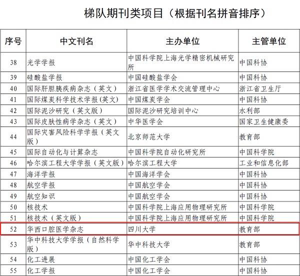 2019年11月22日,中国科技期刊卓越行动计划办公室发布了“关于下达中国科技期刊卓越行动计划入选项目的通知”。华西口腔主办的《国际口腔科学杂志(英文版)》(International Journal of Oral Science, 以下简称IJOS)入选中国科技期刊卓越行动计划领军期刊项目,是全国5000多种科技期刊中遴选的22种领军期刊之一。这是IJOS继2013年、2016年两次获得“中国科技期刊国际影响力提升计划项目(A类项目)”后,再次获得国家级重大期刊类项目支持。《华西口腔医学杂志》入选中国科技期刊卓越行动计划梯队期刊项目。该项目在全国5000多种科技期刊中择优遴选200种(英文100种,中文100种)具备一定办刊基础和发展潜力的科技期刊,作为梯队培育目标。