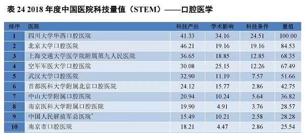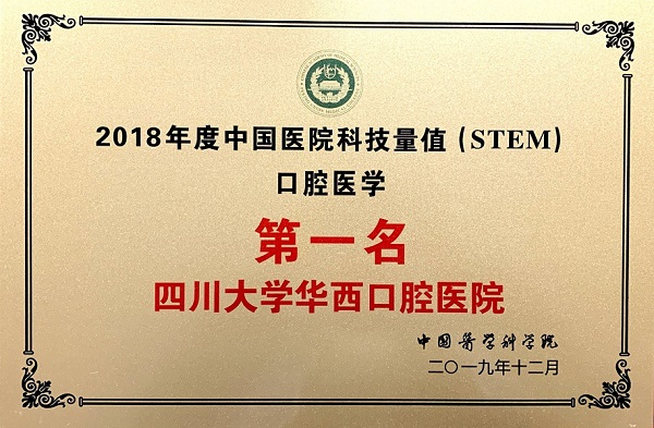 2019年12月19日下午,由中国医学科学院主办的“2018年度中国医院/中国医学院校科技量值(STEM)发布会”在北京举行。在此次公布的“2018年度中国医院科技量值(STEM)”中,四川大学华西口腔医院连续六年蝉联口腔医学第一名。