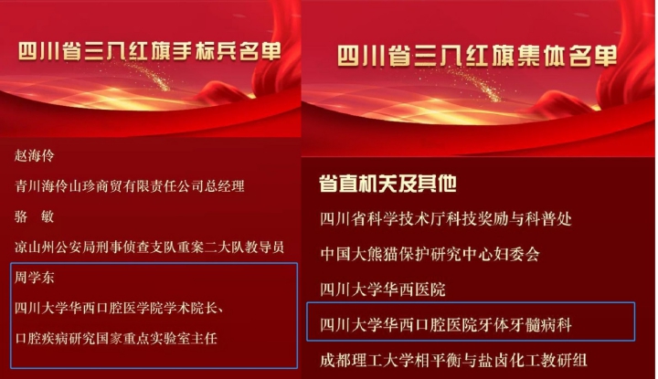 为表彰先进、树立典型,广泛宣传优秀女性和集体的先进事迹,用榜样的力量引导和激励广大妇女,四川省妇女联合会、四川省人力资源和社会保障厅授予我院周学东教授四川省“三八红旗手标兵”称号,授予我院牙体牙髓病科四川省“三八红旗集体”称号。