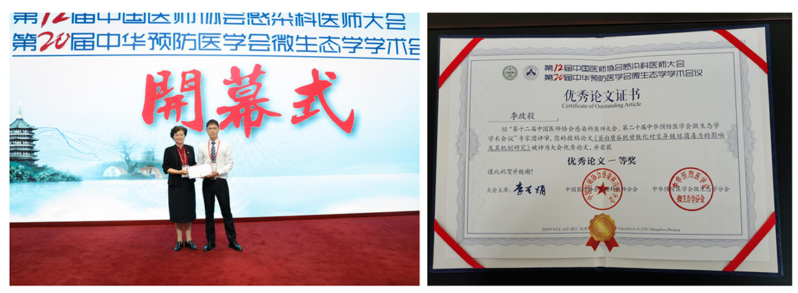 口腔疾病研究国家重点实验室组织了50多篇研究文章参加大会。重点实验室口腔微生物微生态周学东教授研究团队、华西口腔医院博士研究生李政毅的文章《蛋白质谷胱甘肽化对变异链球菌毒力的影响及机制研究》,经过专家们的严格评审,荣获全国唯一的大会优秀论文一等奖,李兰娟院士亲自为李政毅博士颁发了获奖证书。