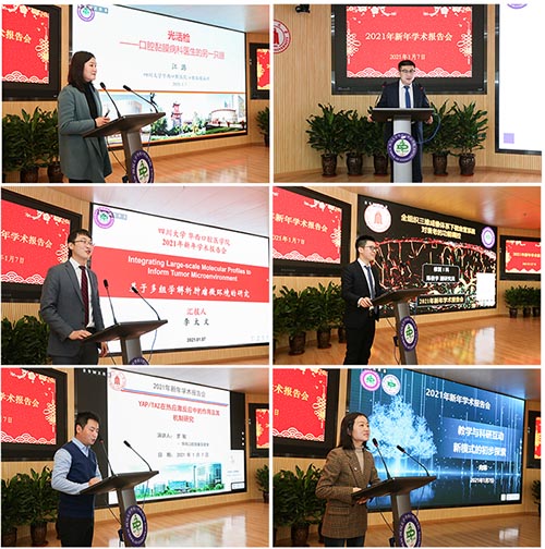 本次新年学术报告会邀请了我院多名优秀青年科学家、医生、教师作报告。江潞教授、程磊教授、李太文副研究员、陈俊宇副研究员、罗敏助理研究员分别为大家作了题为“光活检——口腔粘膜病科医生的另一只眼”“季铵盐防治口腔慢病的研究”、“基于多组学解析肿瘤微环境的研究”、“全组织三维成像体系下微血管系统对衰老的功能调控”、“YAP/TAZ在热应激反应中的作用及其机制研究”的精彩报告。向琳副教授与大家交流了“教学与科研互动新模式的初步探索”。最后,现场师生对相关研究的临床应用及未来前景、教学中的困惑、不同学科之间交叉创新等问题进行了热烈交流,全院师生们享受了一次精彩纷呈的学术盛宴。