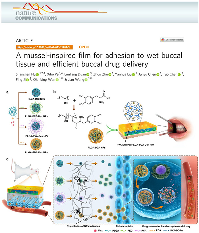 近日,我院万乾炳/王剑教授团队在Nature子刊《Nature Communications》上发表了题为“A mussel-inspired film for adhesion to wet buccal tissue and efficient buccal drug delivery”的论文。我院2017级博士胡杉杉和裴锡波副教授为该论文的共同第一作者,我院万乾炳教授、王剑教授为共同通讯作者。